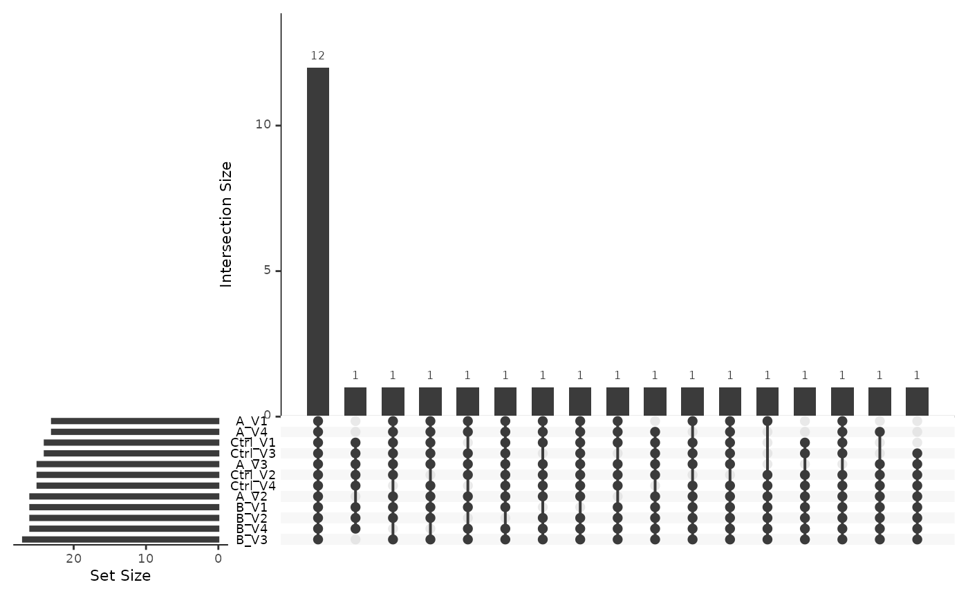 UpSetR::upset(pups$data , order.by = "freq", nsets = pups$nsets)